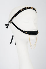 Unleash your inner sex goddess wearing the Noir Double Gag. Ultra-comfortable and versatile. This gag is sure to leave you and your admirers speechless. The gold crystals, studs, and draped gold chain add to the allure of decadent sensuality.