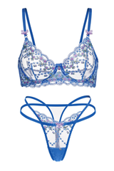 Radiate confidence and charm in this stunning royal blue lingerie set. Crafted from sheer mesh and adorned with intricate floral embroidery, it beautifully highlights your natural shape with a blend of delicacy and boldness. The underwire bra provides gentle lift and structure, while the matching thong features dainty scalloped edges and satin bow accents for a feminine finish.