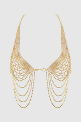 Turn every moment into a grand entrance with the Rhinestone Net Halter in gold. Designed for women who crave luxury and confidence, this rhinestone halter has an openable front with cascading crystals that catch the light with every movement. The deep V-neckline and structured layering offer both seduction and support, making it the perfect luxury halter neck body jewelry for a night out, romantic evening, or bridal celebration. Whether paired with a sleek skirt or layered beneath a blazer, this elegant gold halter ensures you’ll sparkle with intention.