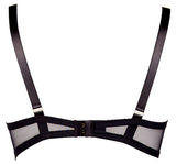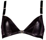 Sheer tulle and mesh are contrasted with beautifully soft Japanese Plonge leather in Something Wicked's iconic Montana soft cup bra. Although a soft cup, Montana has boning hidden on the sides to give the perfect mix of cool comfort and structure. This bold, yet flirtatious bra is perfect under a sheer shirt, giving a flash of leather, soft tulle, and gold metal components.