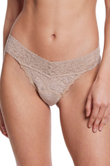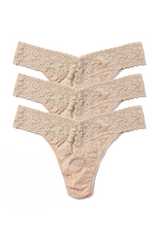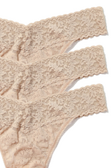 A lingerie drawer essential, elevated in every way. The Ballerina 3-Pack Lace Thongs in Chai includes three soft, stretchy lace thongs crafted in a timeless floral pattern. With a flattering V-front waistband, original-rise cut, and ultra-comfortable fit, this lace thong set is designed to disappear under clothes while making a statement underneath.