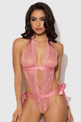 The Kiki Satin and Lace Drop Off Teddy is your invitation to unapologetic allure. Crafted from delicate pink floral lace and trimmed with satin ribbon ties, this halter-style teddy features a plunging neckline and an ultra-high-cut leg that sculpts your silhouette to perfection. The adjustable satin sash cinches the waist, while the open sides and dramatic drop-off cut create a captivating reveal.
