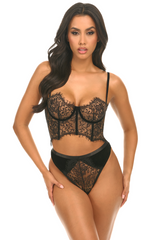 Indulge in elegance with this exquisite lingerie set, where luxurious lace meets the sensual touch of soft velvet. Designed to enhance your curves, the structured bustier provides both support and allure, featuring intricate lace detailing that adds a touch of sophistication. Paired with a matching g-string for a seamless and sultry finish, this set is the perfect blend of comfort and seduction.