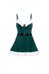 Elevate your holiday lingerie collection with the Holly Chemise, a luxurious emerald green velvet piece accented by soft white faux fur trim. This elegant holiday dress features supportive underwire cups, a gracefully flared skirt, and a detachable belt that defines the waist for a sophisticated silhouette. Adorned with a delicate red bow and golden bells at the bust, the Holly Chemise invites you to embody a captivating Mrs. Claus. Perfect for a romantic Christmas night or festive moments, it inspires confidence and seasonal allure. Complete the look with sheer stockings and a touch of mistletoe charm for an unforgettable festive ensemble.