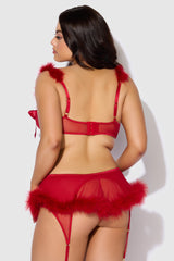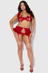 Unwrap pure temptation in the Marilyn Feather and Mesh Plus Size Lingerie Set. A bold statement of indulgence and confidence. Designed to embrace curves with unapologetic glamour, this red-hot set features soft mesh panels, sultry satin ribbon bows, and luxurious feather trim that flirts with every movement.