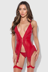 Turn up the heat with the Phoenix Chemise Set in bold, fiery red. Crafted from high-quality faux leather, this sultry piece features a plunging neckline and seductive gold front zipper closure. The daring silhouette is accentuated with playful fringe details that sway with every move, offering a flirty twist on classic lingerie. Adjustable shoulder straps ensure a perfect fit, while attached garters add an extra touch of allure. Pair it with your favorite stockings for a show-stopping bedroom look or wear it solo to make a statement.