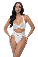 The balconette-style bra provides flattering lift with soft lace trim, while the ultra-high-cut panty elongates the legs and sculpts the hips. Perfect for the bride who desires a striking silhouette without sacrificing sophistication, Sadie redefines what it means to be unforgettable.