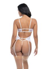 Romantic, refined, and seductively sheer. The Portia Lingerie Set is an ethereal three-piece ensemble designed to celebrate the art of intimacy. Featuring an underwire bra with sheer embroidered lace cups, a coordinating high-leg thong, and a matching scalloped garter belt, this white bridal lingerie set blends elegance with allure.