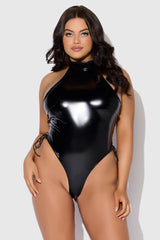 Step into seduction with the Trinity Plus Size Bodysuit. A bold and empowering piece from our Wetlook Lingerie Collection. Designed with a high-gloss, patent finish, this curve-hugging one-piece features a high halter neckline and ultra-high cut hips that elongate the legs and accentuate your shape. The lace-up sides offer adjustable strappy detailing, creating an irresistible hourglass effect while allowing for a custom fit.