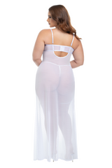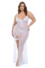 Crafted for the most beautiful curves, this white plus size mesh and lace nightgown features a sheer dotted design, elegant floral lace detailing, and a flowing silhouette that flatters every inch. The sultry thigh-high slit reveals just enough, while the delicate garter strap adds a whisper of seduction. Whether worn on your wedding night or a romantic getaway, this sexy plus size bridal lingerie piece is designed to make you feel irresistible.
