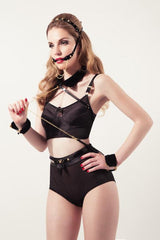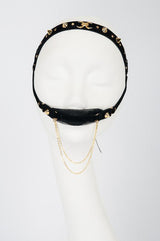Unleash your inner sex goddess wearing the Noir Double Gag. Ultra-comfortable and versatile. This gag is sure to leave you and your admirers speechless. The gold crystals, studs, and draped gold chain add to the allure of decadent sensuality.