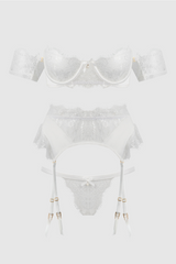 This plus size three-piece lingerie set is the perfect harmony of elegance and allure. A sheer, off shoulder lace bra with detachable sleeves teases just enough, while the high-waisted satin garter belt adorned with delicate floral lace trim cinches beautifully at the waist. Every detail is designed to flatter full curves and celebrate romantic femininity. Ideal for the wedding night or any night that calls for seduction.