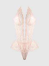 A vision of elegance and seduction, this plus size lace teddy is crafted to embrace and celebrate every curve. The plunging v-neckline draws the eye, while hand-placed pearls along the open gusset offer a delicate invitation to pleasure. Scalloped lace wraps the waist to define and flatter, creating a silhouette that is both romantic and bold. Perfect for unforgettable evenings where intimacy meets artistry.