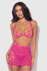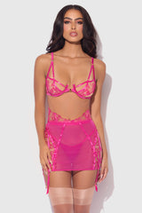 The Nova Lace Lingerie Skirt Set in a sizzling hot pink hue. This sexy, high-waisted lace lingerie set is meticulously crafted with intricate detailing and built-in garter straps, designed to accentuate your curves and seduce.