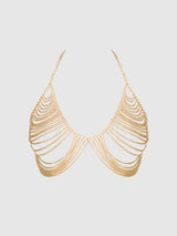 With adjustable chain closures at the neck and back, it ensures a secure, custom fit while enhancing your curves with its unique, fashion forward design. Discover this trendsetting, luxury gold chain draped bralette that's ideal for layering under your favorite outfits or wearing as a bold, standalone piece to elevate your everyday wardrobe.