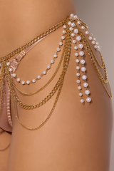 Indulge in exquisite seduction with the Pearl and Chain Draped Garter. This high-glamour lingerie accessory turns your hips into a masterpiece featuring gleaming gold-tone chains and glistening faux pearls that cascade elegantly over your curves, transforming even the simplest thong or lingerie set into a breathtaking statement.