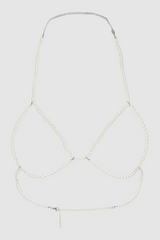 Drape yourself in decadence with the Pearl Triangle Bra Jewelry. A sultry statement piece that redefines sensuality. Crafted with luminous faux pearls and adorned with silver-tone connectors, this open cup pearl bra is an enchanting fusion of vintage glamour and bold eroticism.