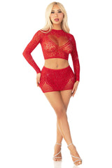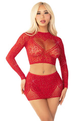 The Gemma Lace Crop Top and Skirt Set, a must have for a fun night out. This chic ensemble features a silhouette-hugging lace crop top and a flirty mini skirt, both enhanced by hand-laid rhinestones and playful heart keyhole accents for a touch of glamour.