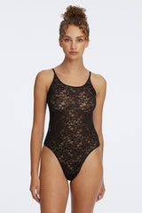 Embrace subtle allure with our Lace Bodysuit. This elegant one-piece features intricate black floral lace that creates a beautifully textured and slightly sheer effect. The simple scoop neckline and delicate spaghetti straps offer a classic and comfortable silhouette.