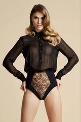 A blouse bodysuit designed to fulfill your fantasy of wearing lingerie to the office, the Lula Long Sleeve Bodysuit features sheer silk georgette, a leather collar, and French Leavers lace, and a front placket adorned with Swarovski Crystal studs. Wear this gorgeous bodysuit with a pencil skirt for an eye-catching ensemble.