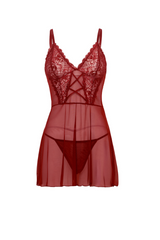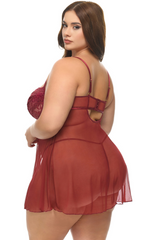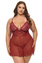 The Avery Mesh Plus Size Babydoll is a sheer mesh lingerie piece that invites romance to flourish with its intricate burgundy lace detailing. Crafted to evoke irresistible femininity, this enchanting babydoll features a plunging neckline framed by adjustable straps, offering shape and support.